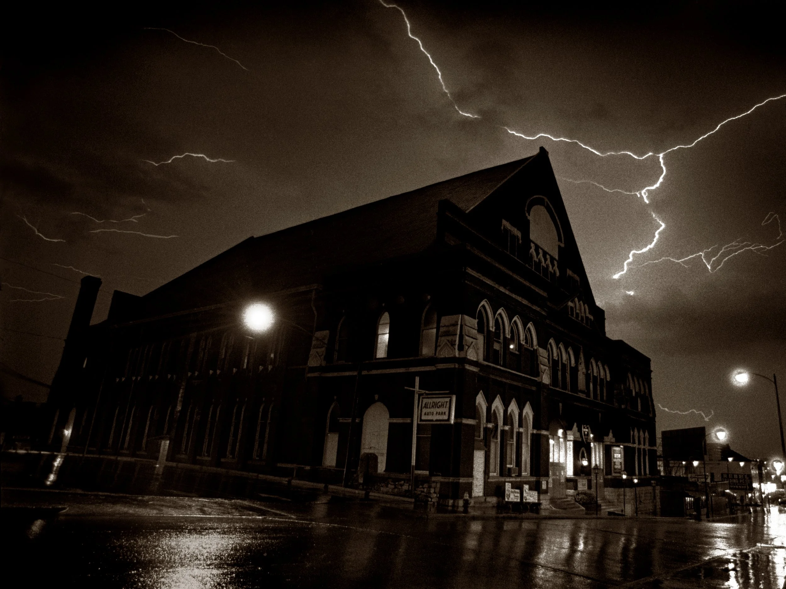 The inspiration for this image came to me in 1974 when there was serious talk about tearing down the Ryman. Every night time thunder storm, I would drag myself downtown to this deserted building trying to get this shot. This night I got lucky. I forgot to take my tripod along so this was actually taken with my camera resting on the open window sill of my 56 Buick. Nikon f….35mm Tri-X film….28mm lens…...three of the best seconds of my life.