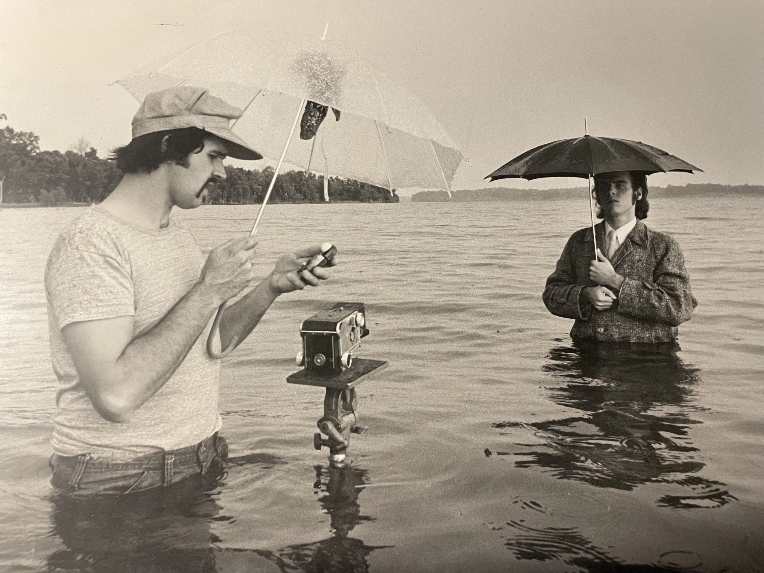 One of my favorite early location photos. My trusty assistant, R B Miller taking light reading... Percy Priest Lake, Nashville, 1975…shooting John Hiatt's first album cover “OverCoats”.